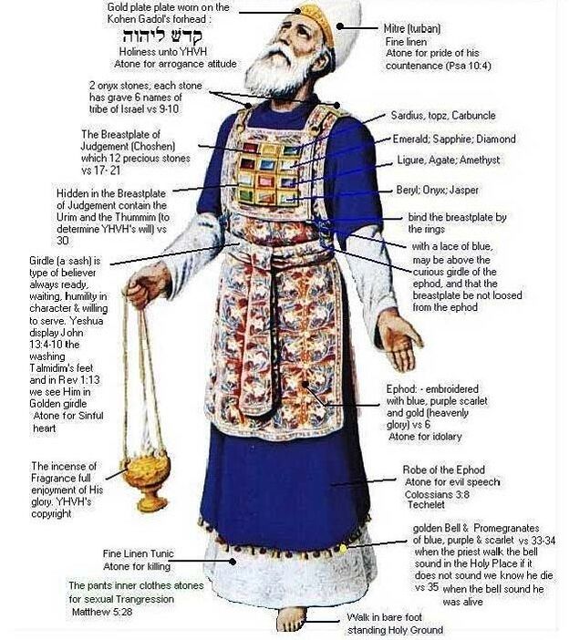 - A turban-style headdress with a gold banner reading “Holy to YHVH” (Exodus 28:36-37)